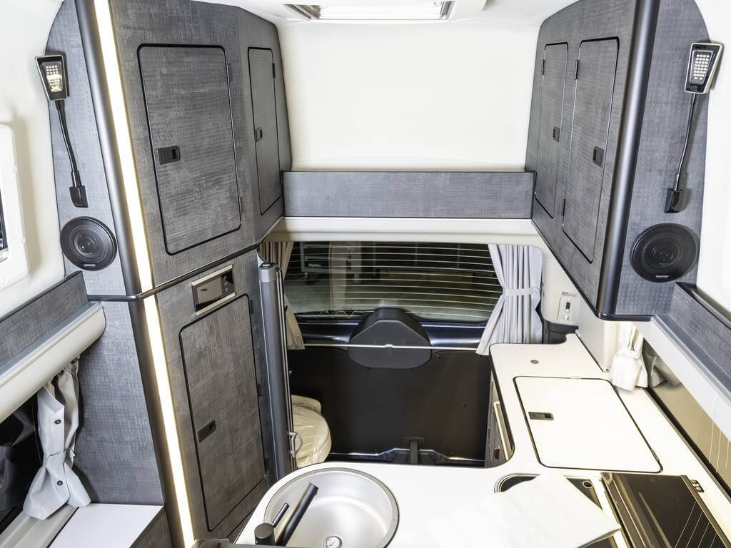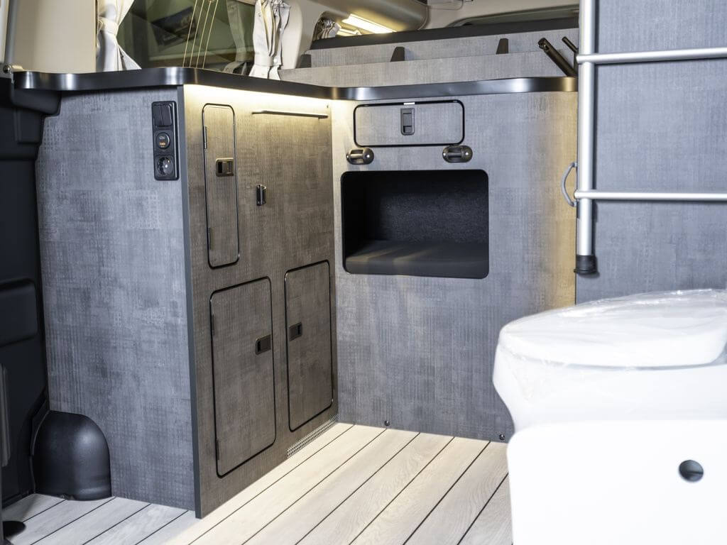Das verlängerte Fahrzeug bietet deutlich mehr Stauraum als die Standardvariante. Hohe Schränke neben dem Sanitärbereich, Dachstaufächer im Hochdach und Hängeschränke über der Küche bieten viel Platz für Gepäck und Campingzubehör. Auch unter der Rückbank und im Küchenblock stehen weitere Stauräume zur Verfügung. Die Innenstruktur ist so aufgebaut, dass jedes Fach auch während der Fahrt gut zugänglich und sicher verschlossen bleibt.