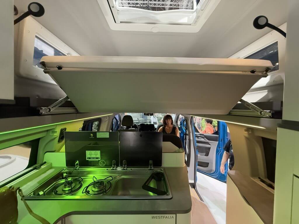 Die Kombination aus durchgehender Stehhöhe, klarer Raumaufteilung und modernen Materialien sorgt für ein sehr angenehmes Wohngefühl. Schlafen, Wohnen und Kochen sind klar getrennte Zonen, die sich im Alltag nicht in die Quere kommen – so findet jeder seinen Platz im Fahrzeug. Warm abgestimmte Oberflächen, dimmbare LED-Beleuchtung und gut platzierte Lichtquellen schaffen abends eine gemütliche Atmosphäre, tagsüber lassen die großen Fenster viel Tageslicht hinein. Das Fahrzeug wirkt trotz kompakter Außenmaße luftig und offen – ideal für lange Reisen, bei denen sich der Nugget wie ein kleines, mobiles Zuhause anfühlen soll.