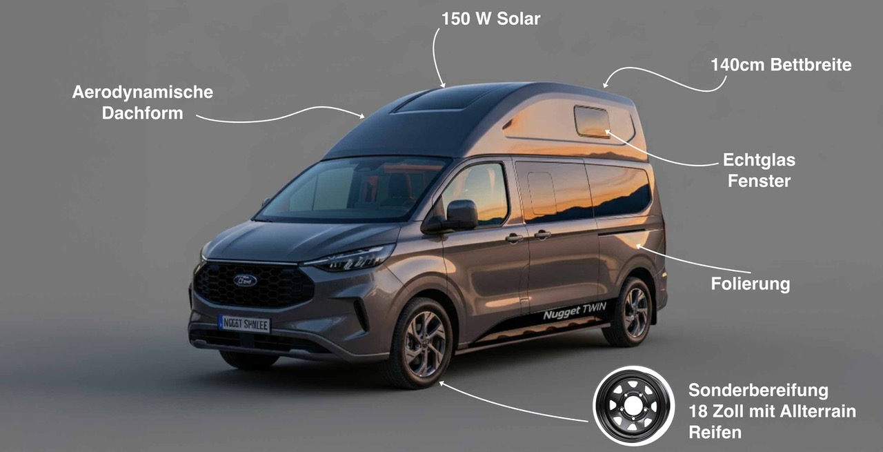 Das Nugget Basisfahrzeug wickeln wir bequem für Sie über einen unserer Ford Partner ab, sie übernehmen am Ende das Gesamtpaket bei uns in Kochel am See in der Nugget-Schmiede. Gerne können Sie uns Ihren neuen oder gebrauchten Nugget auch selbst anliefern, wir rüsten dann das Hochdach und weiteres Zubehör nach Ihren Wünschen nach.