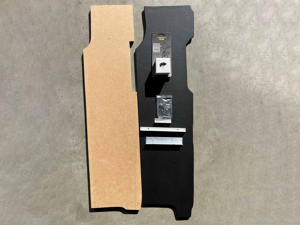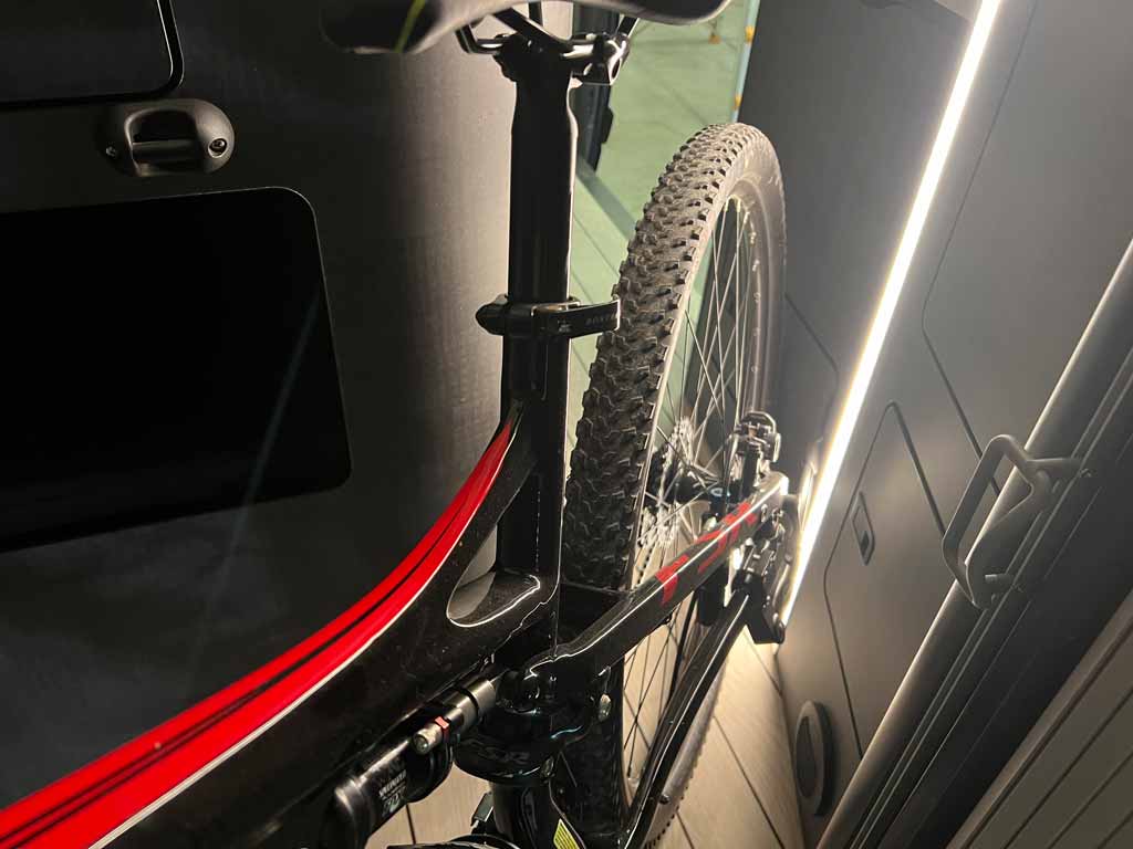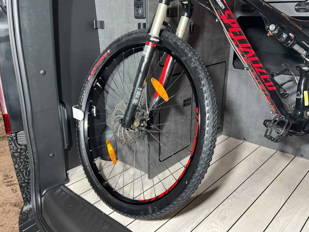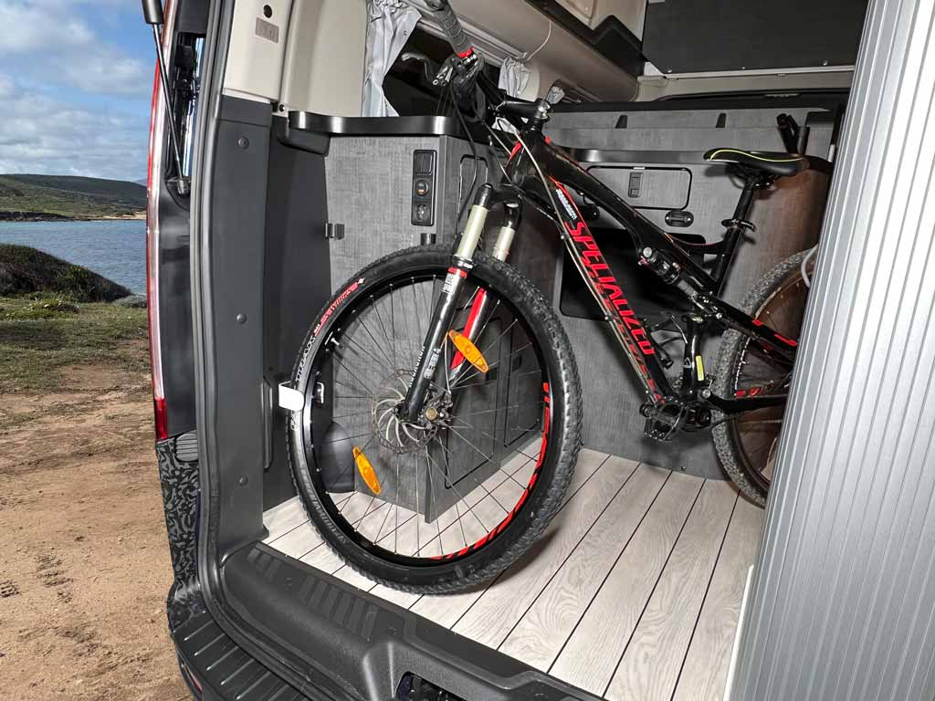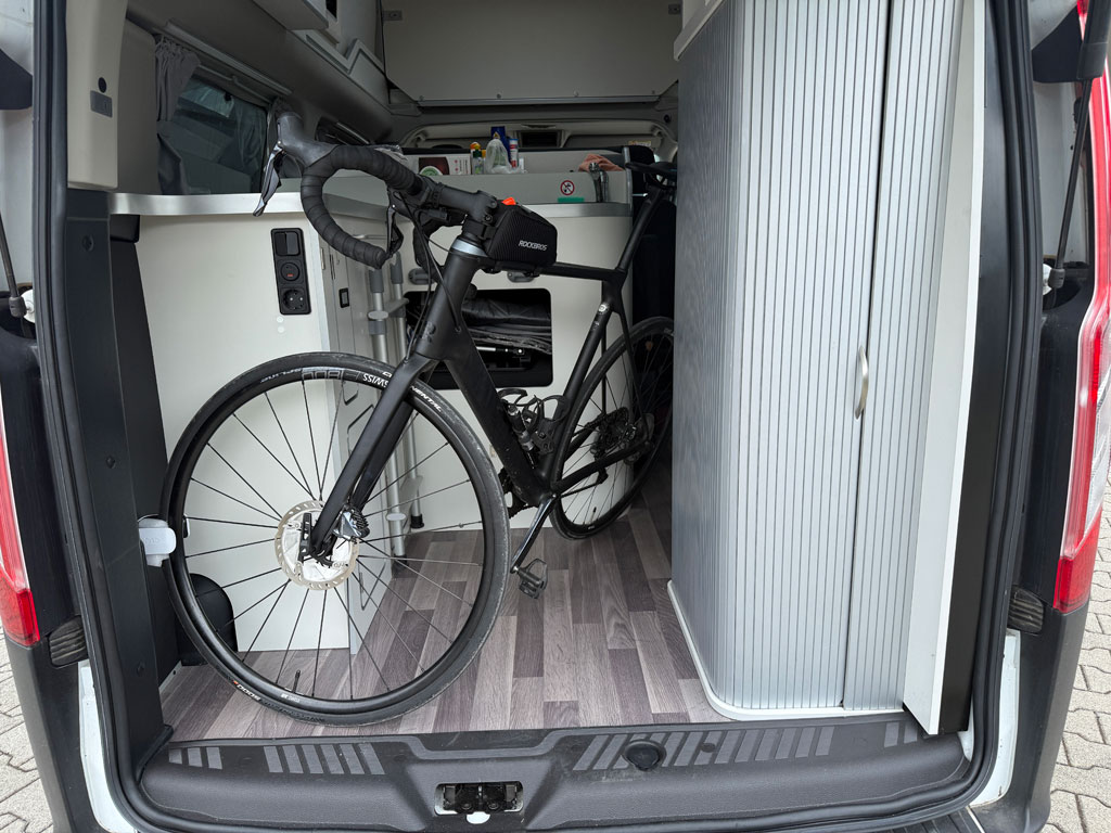 Das Rad wird rückwärts über die Heckklappe in den Innenraum geschoben und mit dem Vorderrad in einer Hornit CLUG-Radaufnahme an der linken Karosseriewand fixiert.