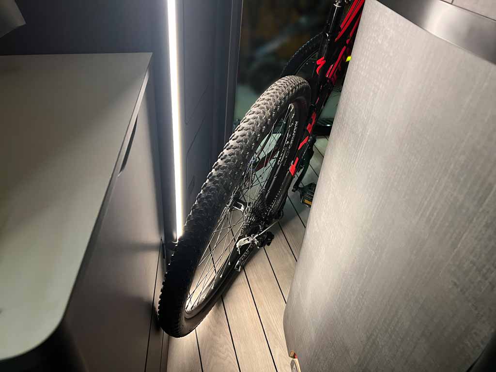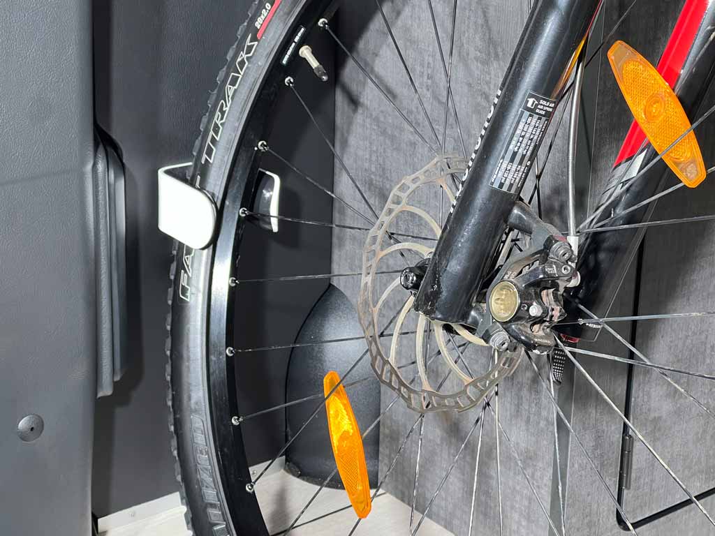 Das Rad steht durch den leichten Druck des Hinterreifens gegen den Schrankbereich von selbst – stabil, sicher und vibrationsfrei.