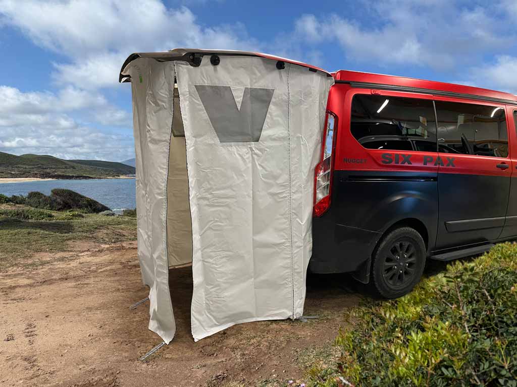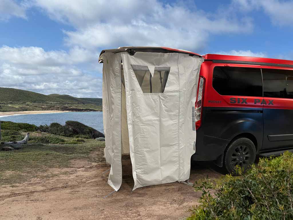 Es lässt sich schnell auf- und abbauen, ist kompakt verstaubar und überzeugt durch seine Wetterbeständigkeit sowie blickdichten Stoff – für mehr Privatsphäre und Komfort unterwegs.